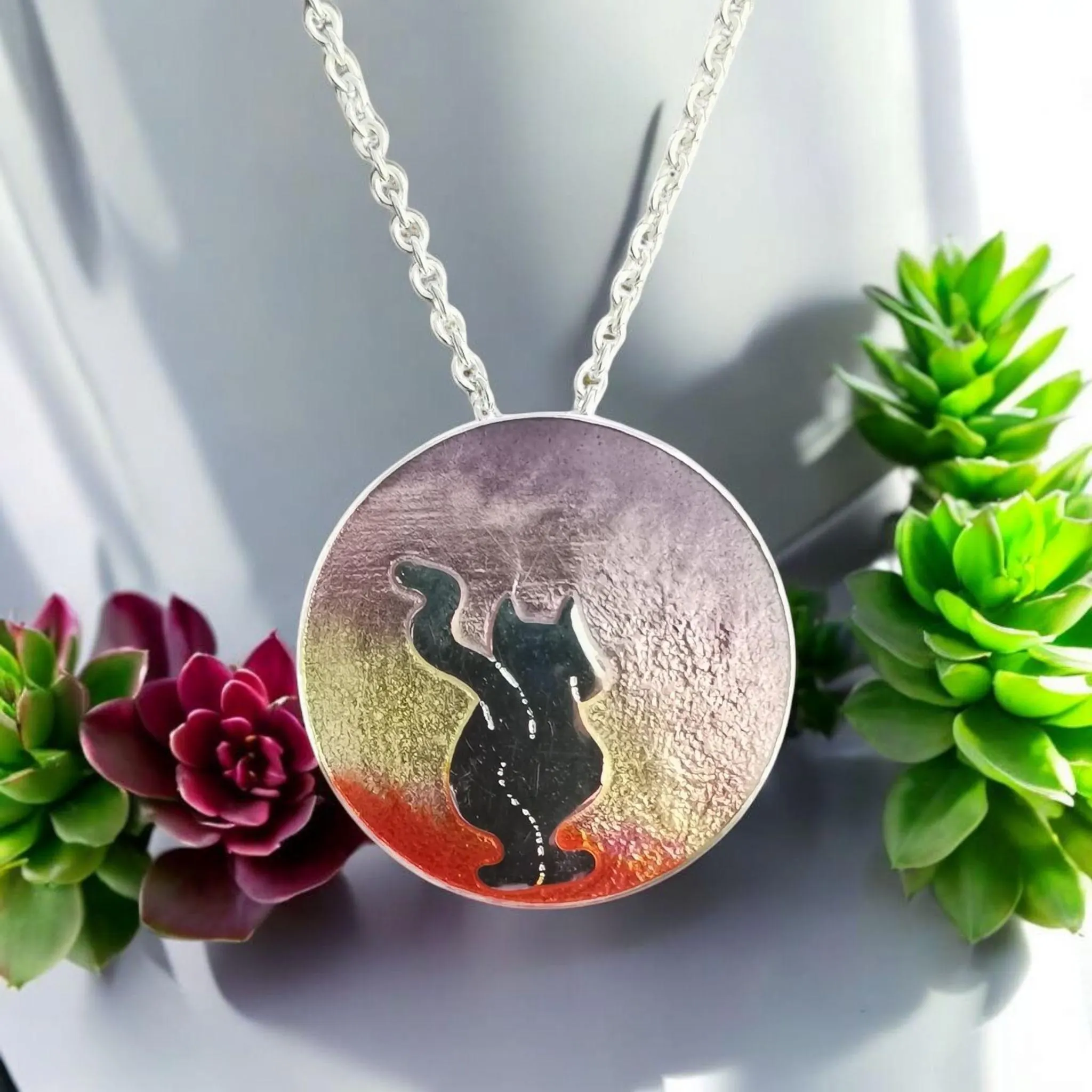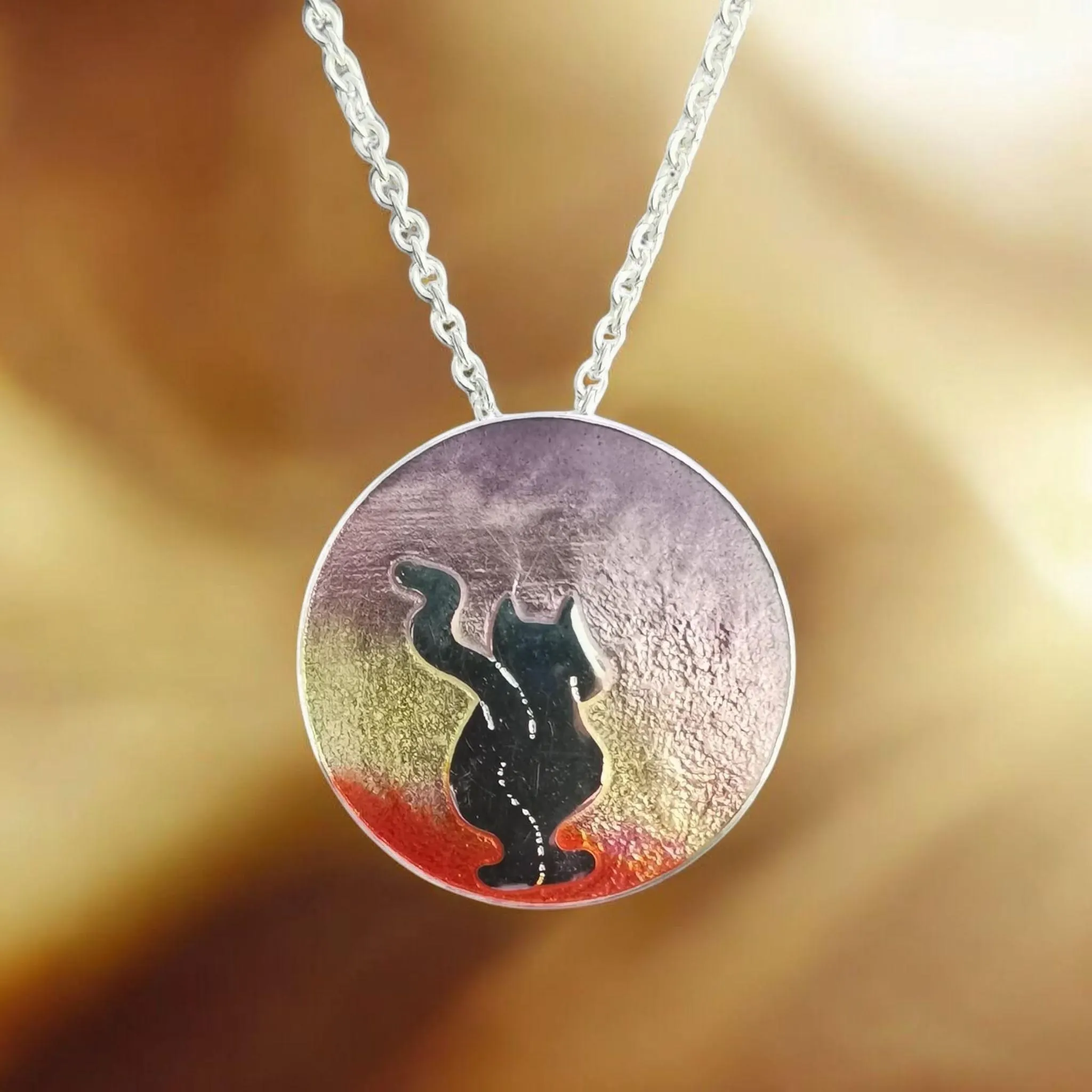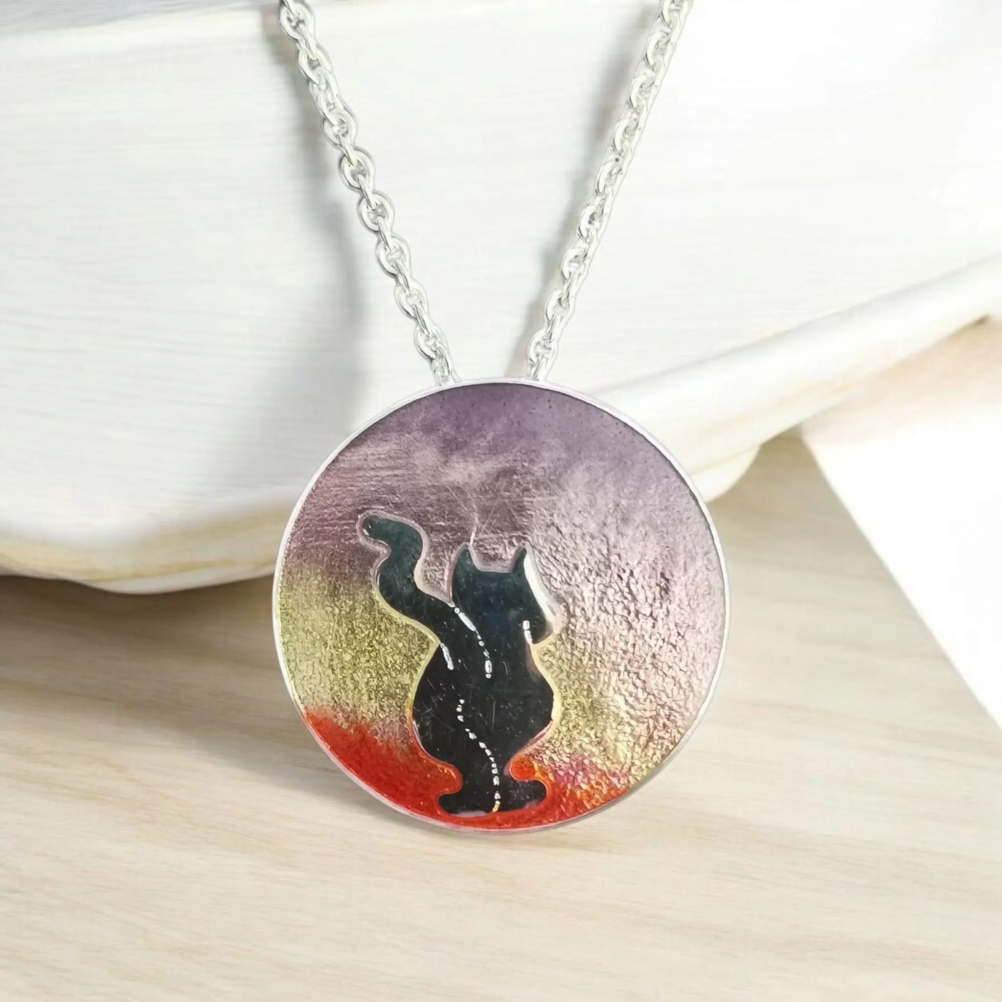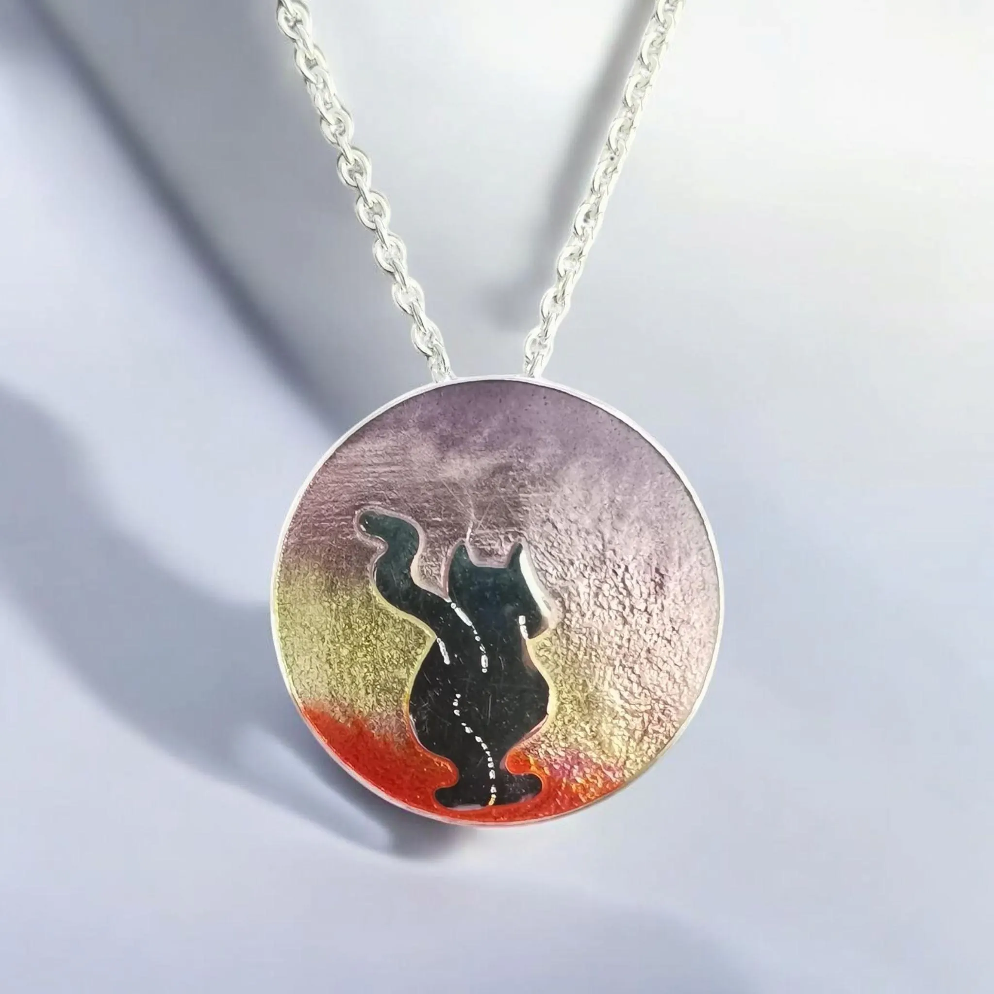 Der kleine Silberanhänger ist in Emaille eingebettet und hat einen blau bis türkis-farbenen Farbverlauf.