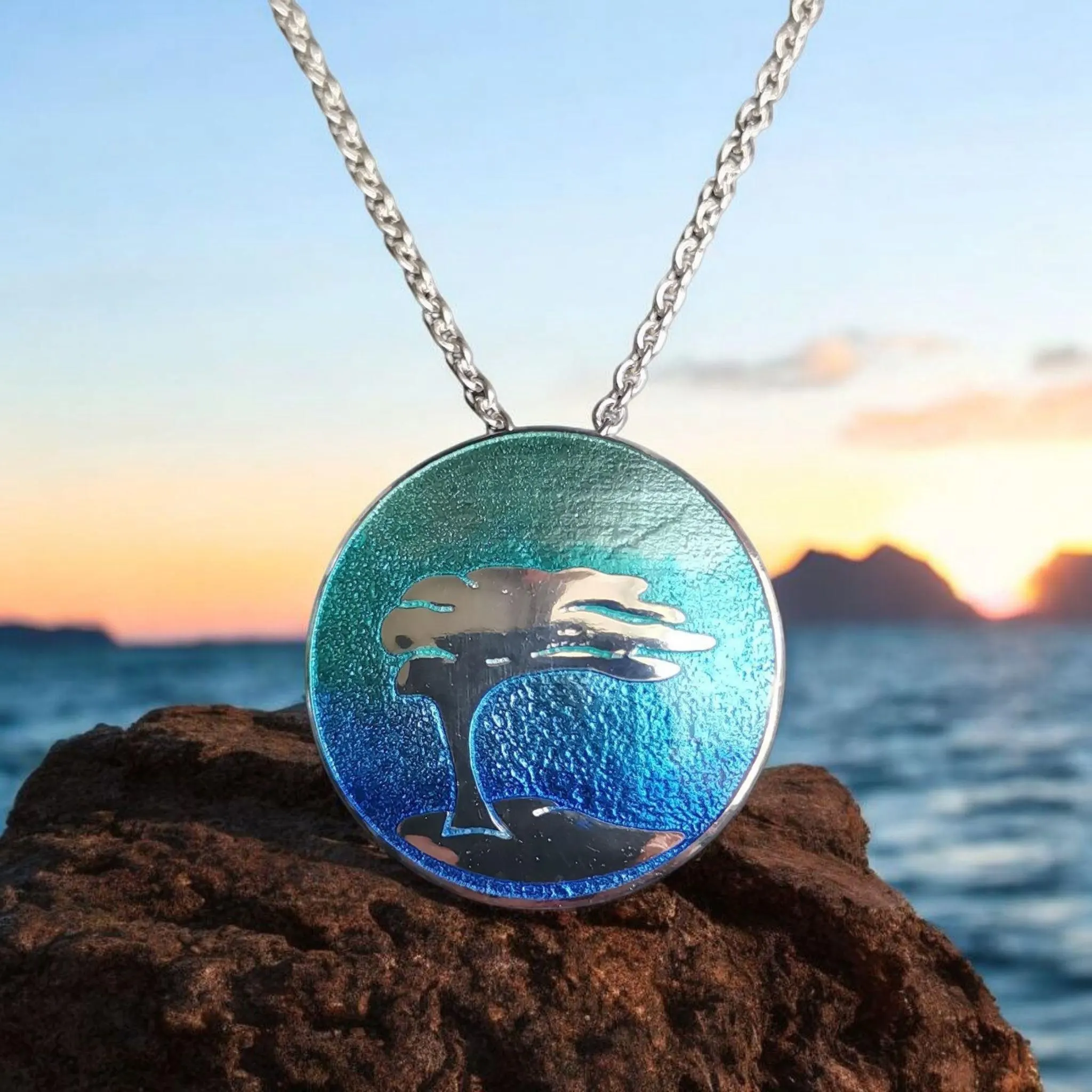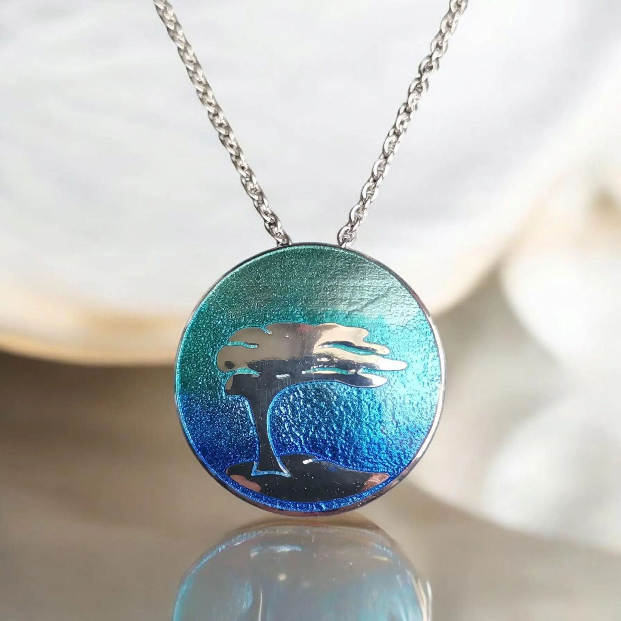 Der kleine Silberanhänger ist in Emaille eingebettet und hat einen blau bis türkis-farbenen Farbverlauf.